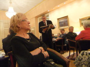 Etter et godt måltid fant vi tilbake til salongen hvor Fladmark startet med underholdning. Han fortale om et intervju han hadde hatt i sine yngre dager med en nu forlengst avdød kollega: Amalie Akselsen. Det var en beretning om et liv gjennom 2 verdenskriger og hennes 45 år i Telegrafverket. En fantastisk beretning vel verd å lytte til. En begynnelse på en enorm teknisk utvikling som hun fikk være med på. Det var artig å høre på alt hun hadde opplevd. Hun må ha vært en meget oppegående dame.