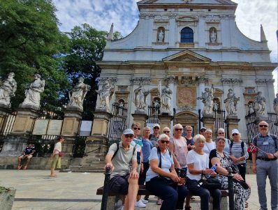 Neste dag var det omvisning i gamlebyen med lokal guide Kristoffer. Han snakket godt norsk, var kunnskapsrik, språkmektig, hyggelig og veldig omstendelig. Vi tok trikk til Wavel slottet som ligger på en høyde ved bredden av elva Wisla. Katedralen her sto ferdig i 1020, men dagens bygg fra 1300 tallet er bygd på ruinene av denne. Her har polske konger blitt kronet og begravd. Her ligger også nasjonalhelter, adelige og andre viktige personer. Slottet ved siden av var kongebolig fra 1038 til 1596 og Polen ble regjert herfra. Fra Wavelhøyden spaserte vi inn mot sentrum av gamlebyen, forbi pave Johannes Pauls bolig og stoppet opp ved St Peter og Paul kirken. ved siden av den lå et nonnekloster hvor beboerne ikke fikk lov å gå ut! Turen ble avsluttet på det